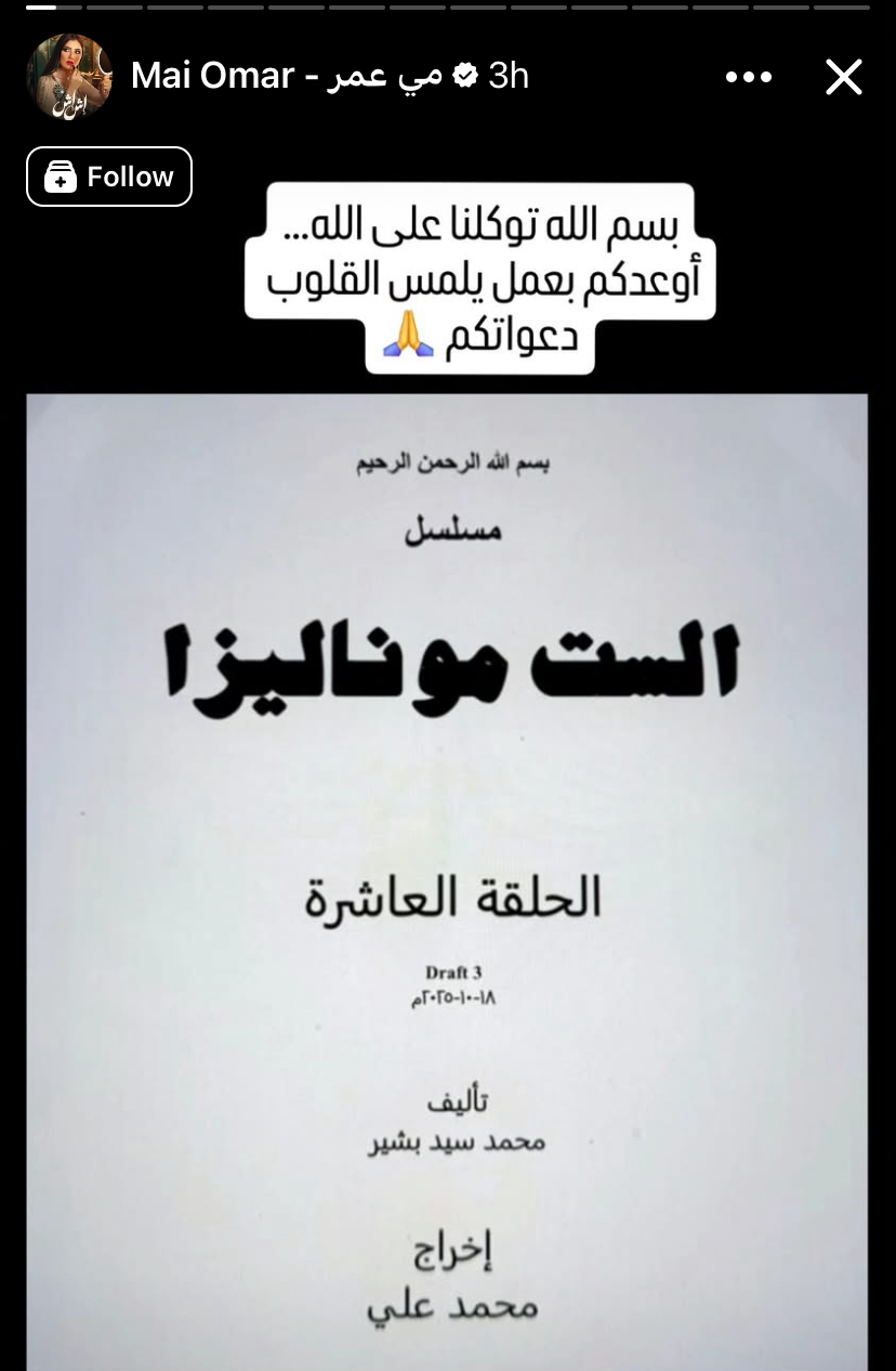 شاركت مي جمهورها صورة من السكريبت على وسائل التواصل الاجتماعي، وقالت: "بسم الله توكلنا على الله، مسلسل الست موناليزا رمضان 2026 إن شاء الله، على بيتي وشركاء نجاحي شاشة إم بي سي مصر".