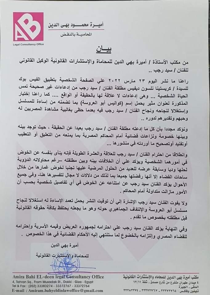 في المقابل، الفنان سيد رجب رفض الكلام مع الصحافة، وأصدرت المحامية الخاصة بيه بيان بيوضح الأمر، قال خلاله إنه حاول يحل الخلافات بينه وبين طليقته بشكل ودي، لكنها رفضت.