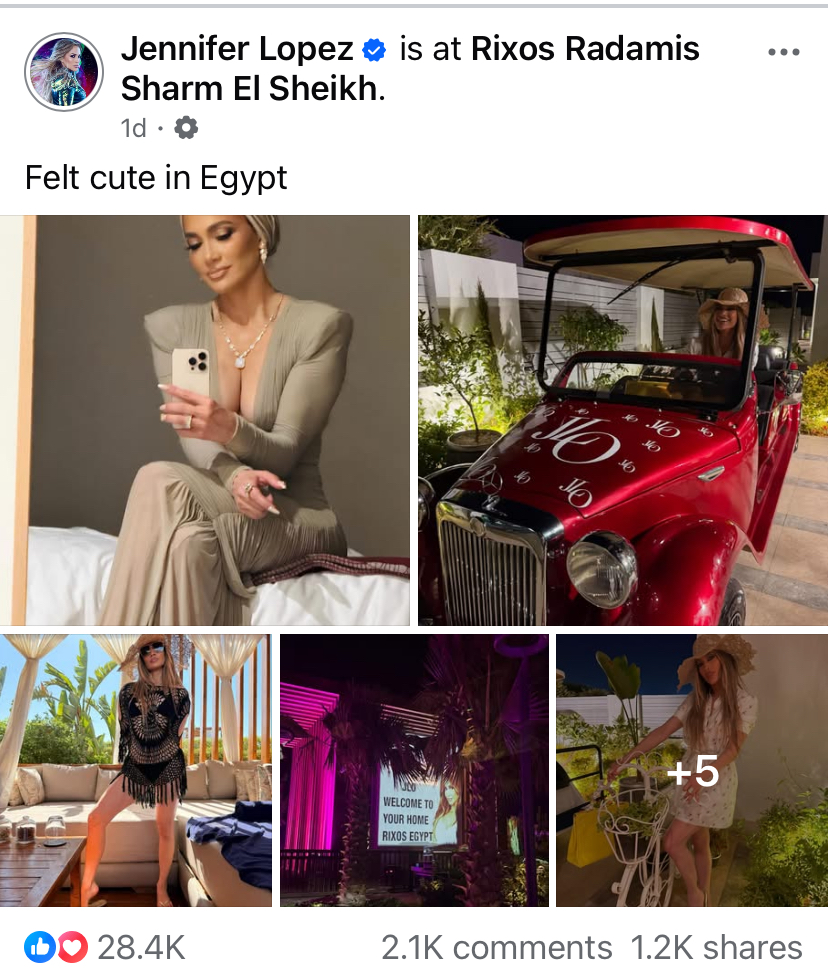 وثقت النجمة العالمية جينيفر لوبيز رحلتها الأخيرة لمصر من خلال صور نشرتها على حساباتها الرسمية، وظهرت فيها مبسوطة وسط أجواء شرم الشيخ بين البحر والجمهور.