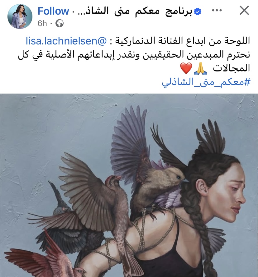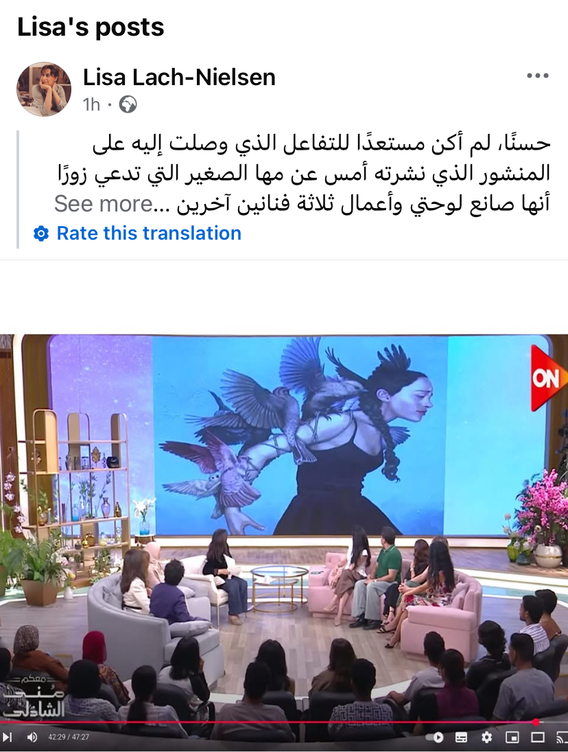 ليزا مسكتتش، نشرت على إنستجرام بوست وضحت فيه، أن لوحتها طرحت في برنامج من غير الإشارة ليها! لأ وكمان تم نسبها لمها الصغير، واعتبرت ده "جريمة" بموجب القانون المصري وحقوق الملكية الدولية.
