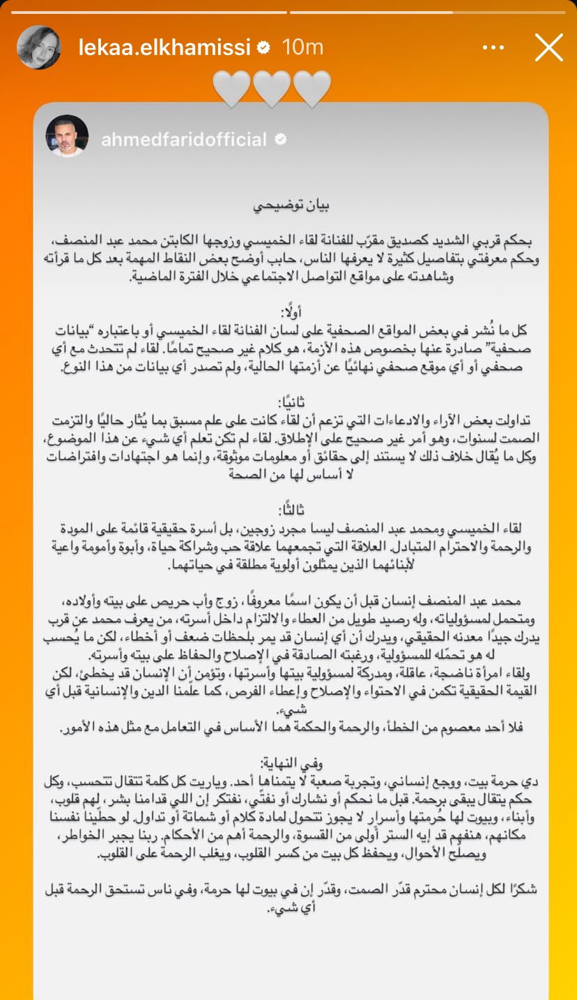 أما أول تفاعل من لقاء الخميسي نفسها فكان مختصر جدًا، أعادت نشر البيان في ستوري حسابها على انستجرام، واكتفت بوضع إيموشن قلب من غير أي كلام إضافي، كنوع من الشكر والتأكيد على التوضيح اللي اتقال.